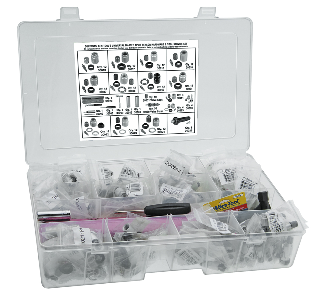 俄亥俄州阿克伦-(2008年4月16日)- ob playKen-Tool通用主TPMS传感器硬件和工具服务集用于轮胎压力监测系统传感器,(项目#30000),是一个全包套件,包括硬件和应用特定的工具,用于维修阀杆TPMS传感器。这套设备确保了轮胎服务技术人员不必从不同的传感器制造商购买多个单独的硬件套件,然后再单独购买昂贵的TPMS传感器服务工具。