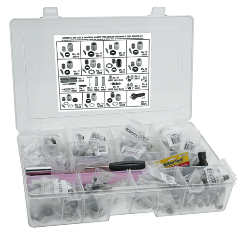 该服务集是一个通用的152件的15个独特的硬件套件,将处理90%的所有配备tpms的车辆在美国。所有必要的专用硬件,包括阀芯和阀帽,垫圈螺母,垫片,垫圈和阀杆。ob playKen-Tool更进一步,采用了新的传感器安装螺钉替换橡胶“卡扣”阀杆套件,这是许多通用汽车最新车型的标准设备。